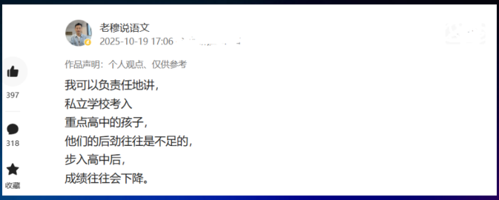 但你说家长有选择吗?难!公办学校摆烂的不少,老师佛系、管理松散,孩子进去就像开盲盒。评论区有个家长哭诉:“不送私立连高中都考不上!”这才是最荒诞的地方——我们明明知道两种模式都有病,却不得不选一种毒药喂给孩子。